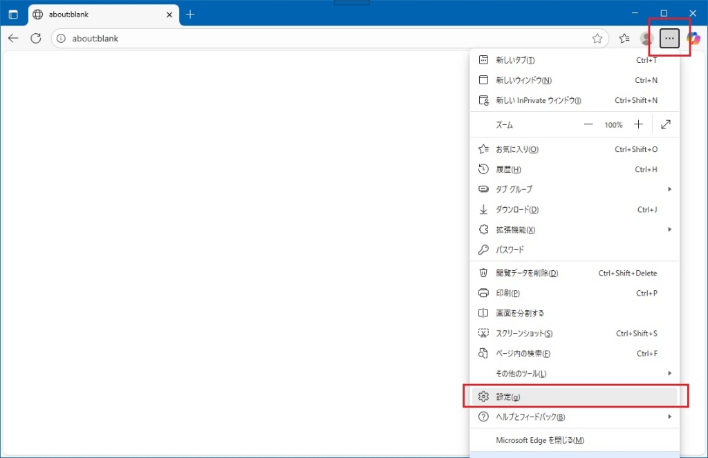 1.Edge画面右上の「…」-「設定」をクリックします。