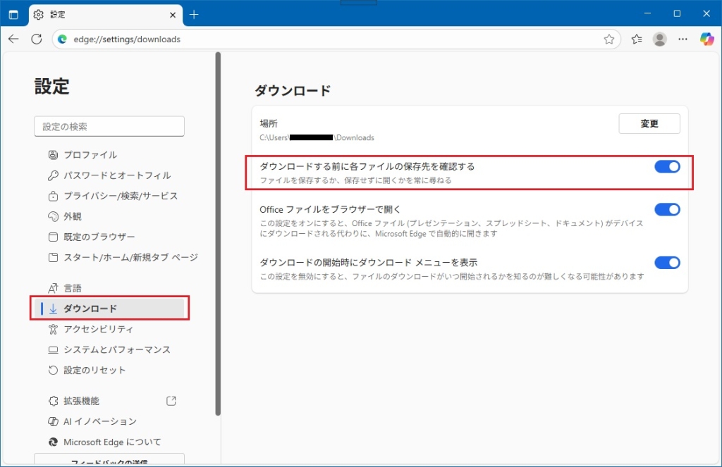2.左のメニューにて「ダウンロード」をクリックし、「ダウンロードする前に各ファイルの保存先を確認する」をONにします。