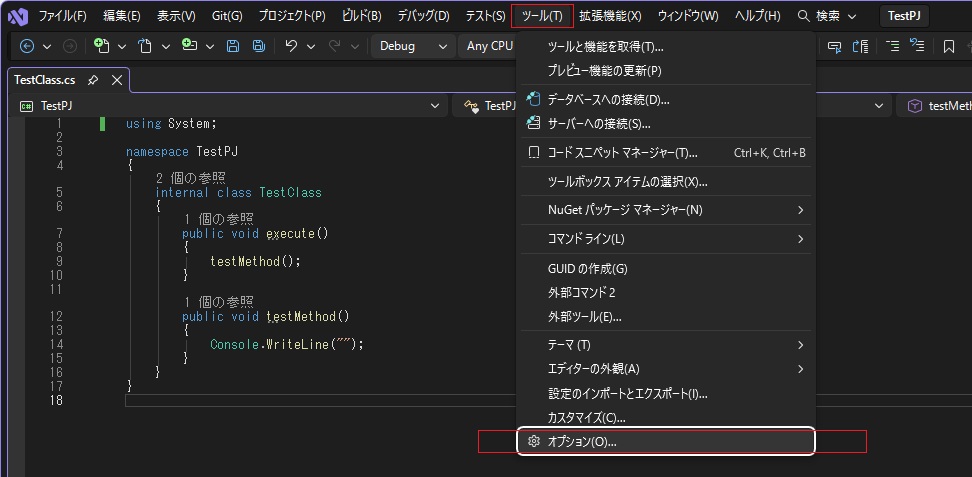 1.メニューの「ツール」-「オプション」を選択します。