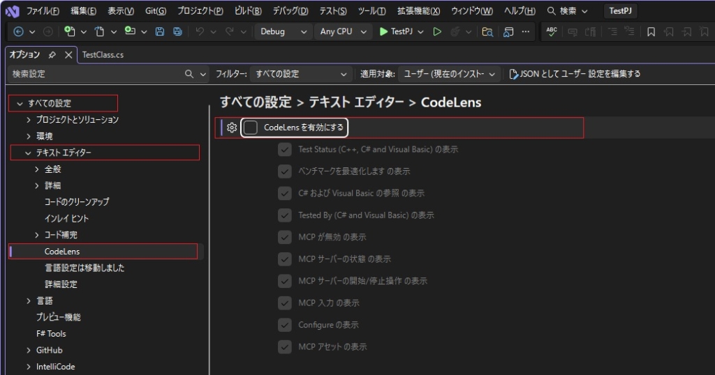 2.「オプション」のタブにて、左ペインで「すべての設定」-「テキストエディター」-「CodeLens」を選択、右ペインにて「CodeLensを有効にする」のチェックをオフにします。